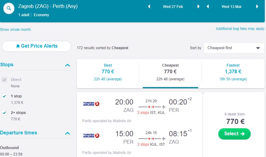 Još uvijek: Australija (Perth) iz Zagreba za samo 764€ December 10, 2018 Aviokarte, Azija Destinacije: Perth, Australija Razdoblje putovanja: 01/2019 – 05/2019 Razdoblje kupnje: do prodaje slobodnih mjesta Avio kompanija: Turkish Airlines, Malindo Air Prtljaga: uključena ručna i check-in prtljaga Primjer letova: Zagreb – Perth 764€ Hotelski smještaj: >>>BOOKING.COM<<< Leave a Reply Cancel Reply Your email address will not be published.CommentName* Email* Website